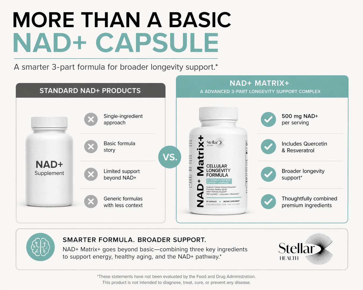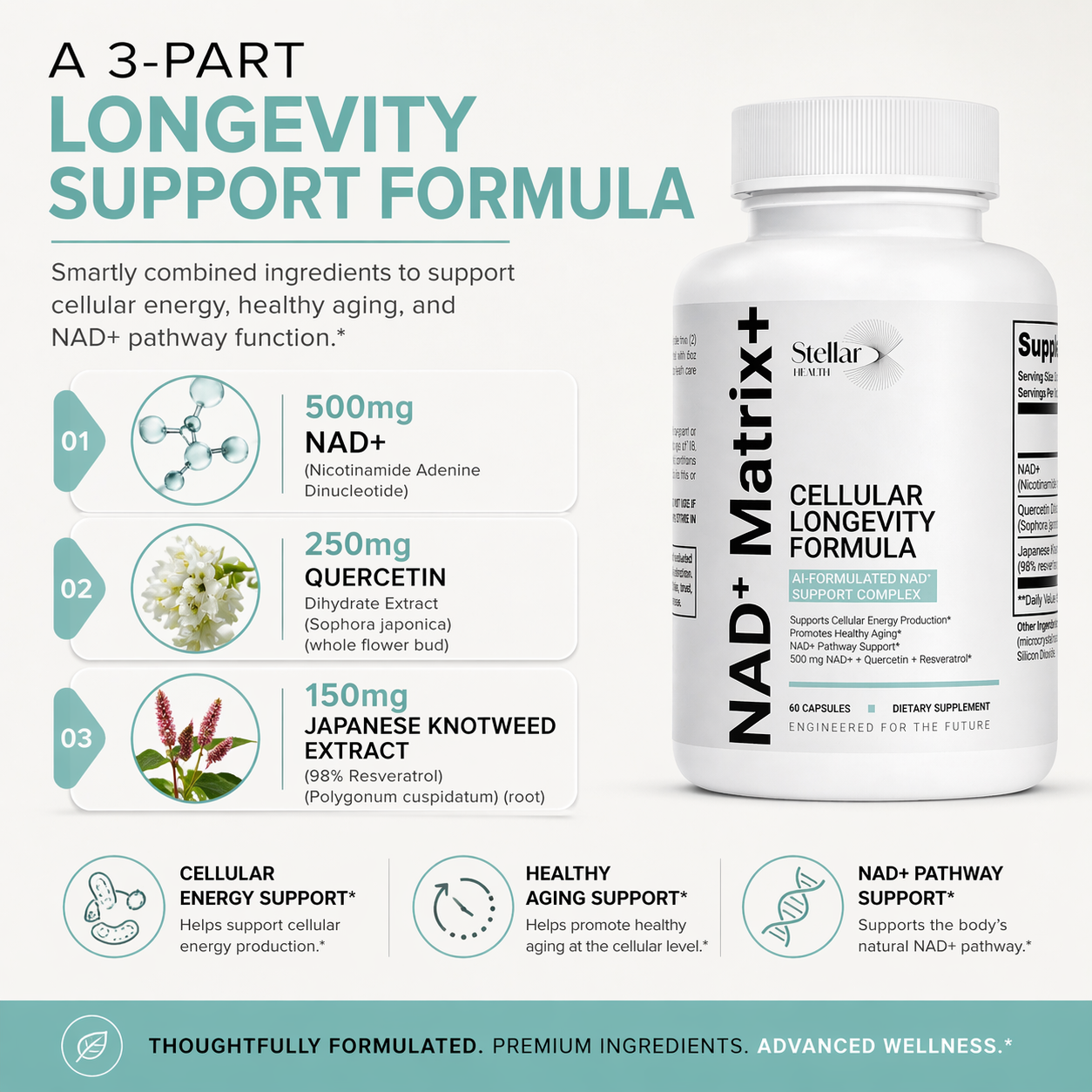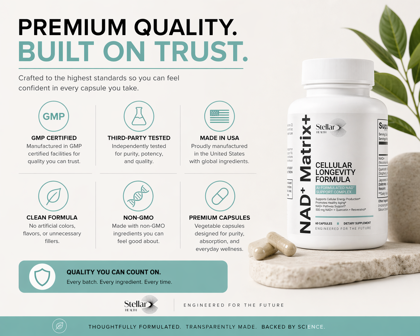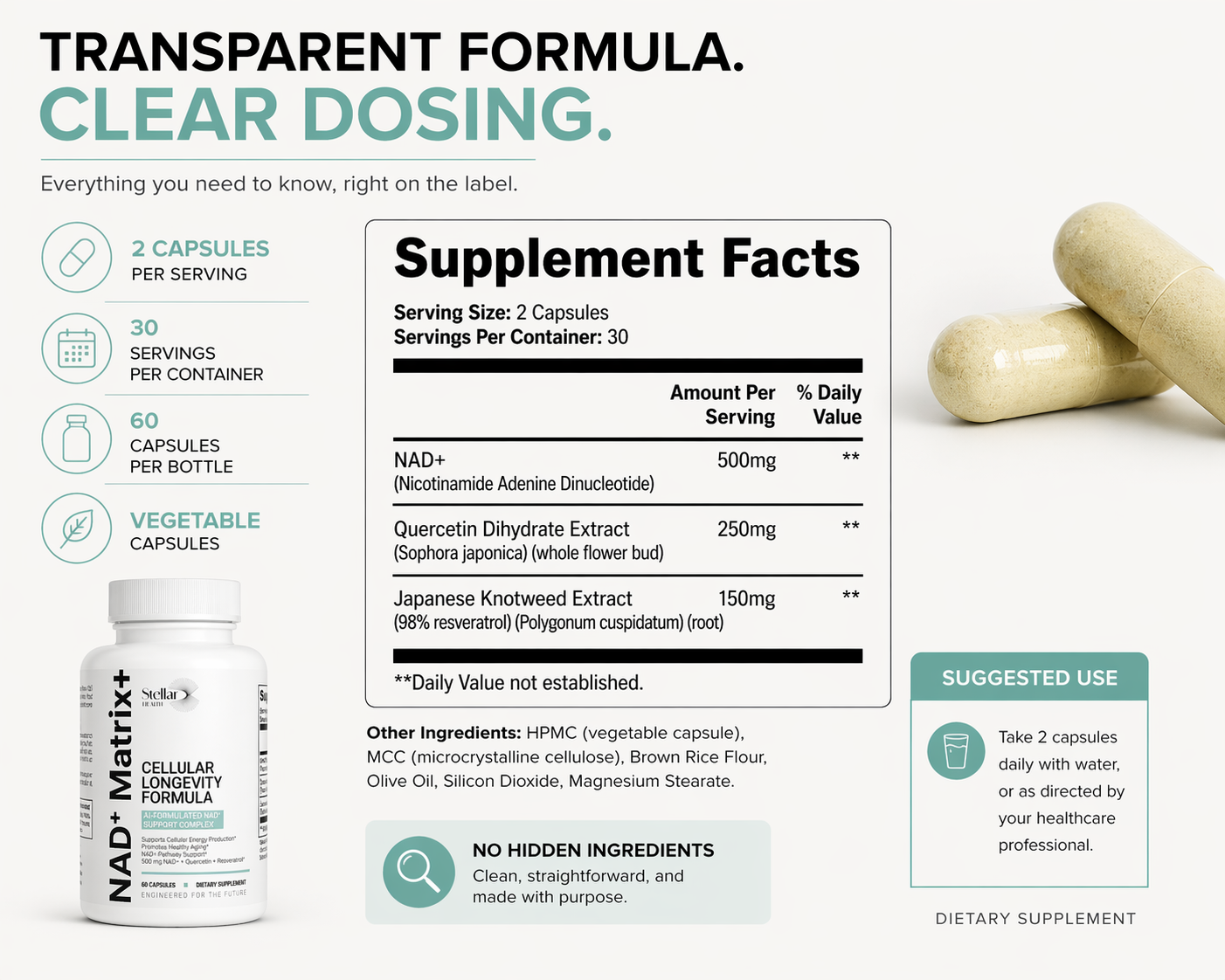 - NAD+ Pathway Support: NR + Apigenin work synergistically to increase NAD+ levels while preventing enzymatic degradation