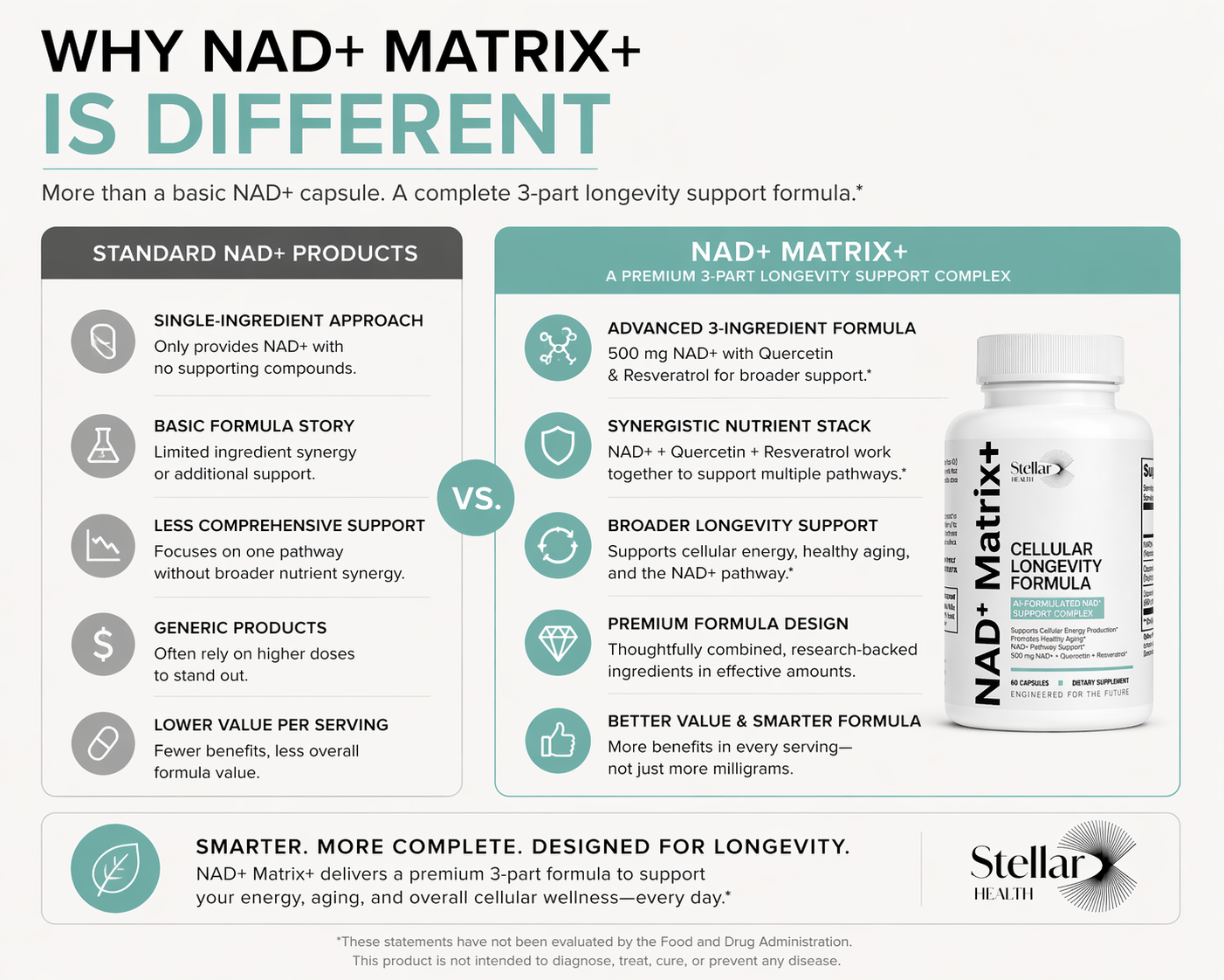 Yes — Shilajit Matrix+ pairs excellently with NAD+ Matrix+ for a comprehensive cellular longevity protocol (the Shilajit already contains NR as a NAD+ precursor, while NAD+ Matrix+ adds direct NAD+ plus quercetin and resveratrol). It also pairs with Omega Matrix+ for complete cell membrane and energy support. The "Ultimate Cellular Energy" stack is Shilajit Matrix+ + NAD+ Matrix+ + Methylene Blue — all three supporting different aspects of mitochondrial energy production simultaneously.